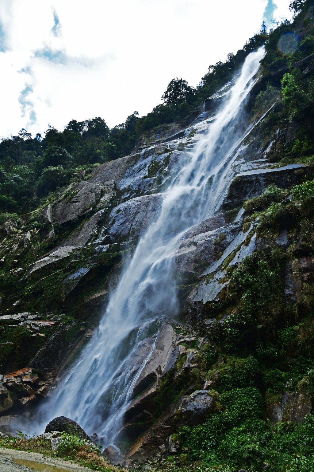 哈滂瀑布位于独龙江乡最南端的马库村委会钦兰当自然村,再往前走几公里便是中缅边界。哈滂瀑布的命名来源于独龙语,意为“万丈悬崖缺口跌落下来一股巨大的水”,当地人称其为“哈巴依称”,意为“月亮上掉下来的水”。