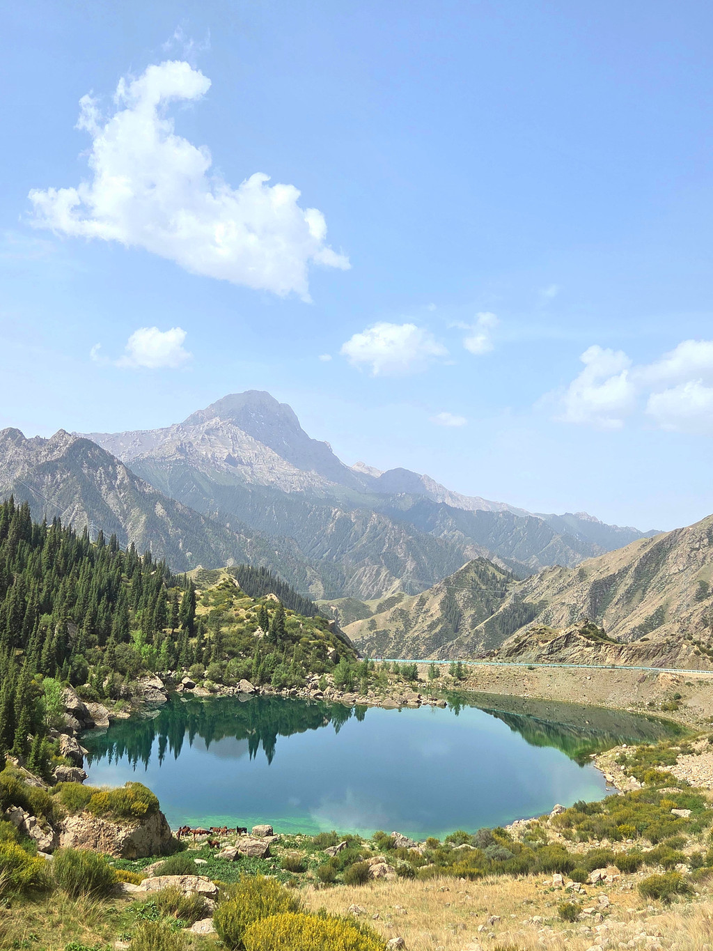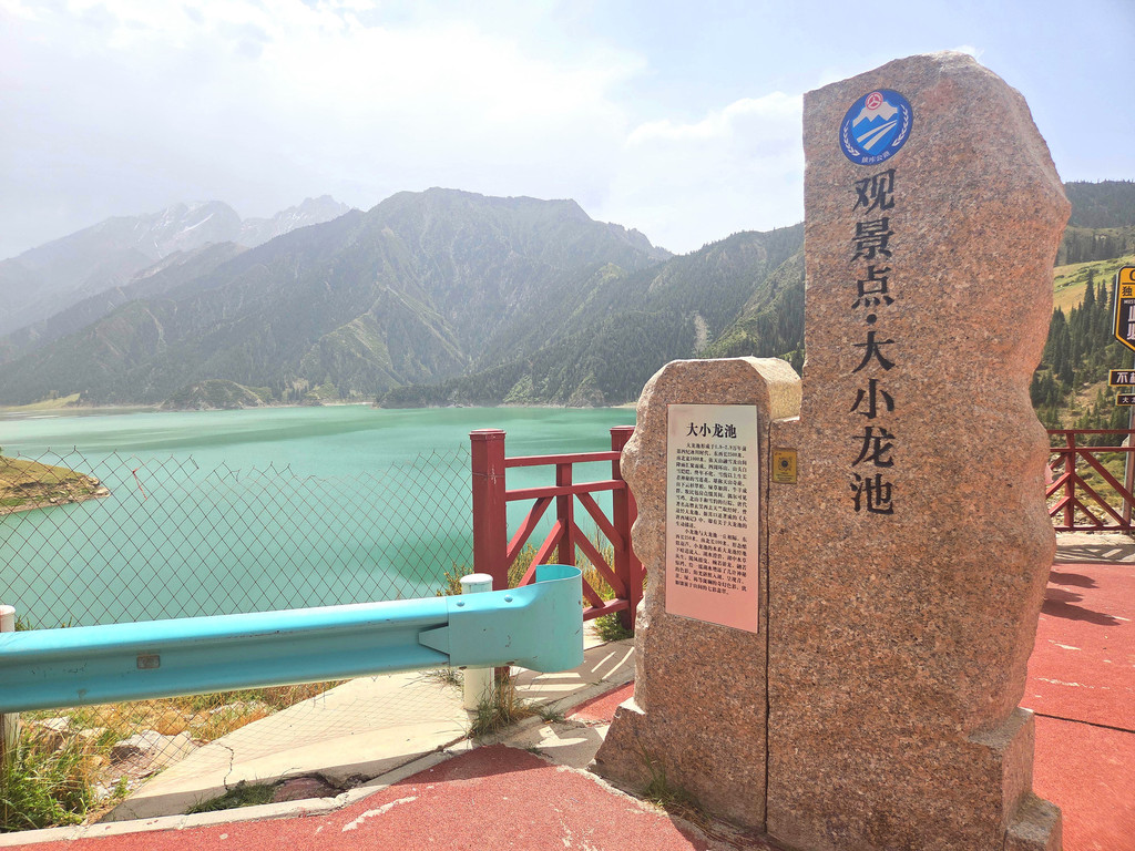 接着来到了大龙池旅游景区。被称为“南天池”的大小龙池也如两块晶莹剔透的翡翠,镶嵌在雪峰环绕的半山腰。大小龙池被誉为天山明珠,独库公路沿湖而过,可以包揽两座湖泊的景色。大龙池形似葫芦,在山腰的陡坡处,水域面积大,湖面青翠;小龙湖则是由大龙湖的水从地下渗透汇聚而成,海拔比大龙池低,景色也是非常靓丽。