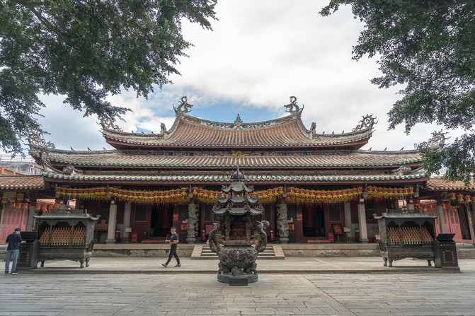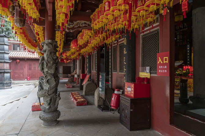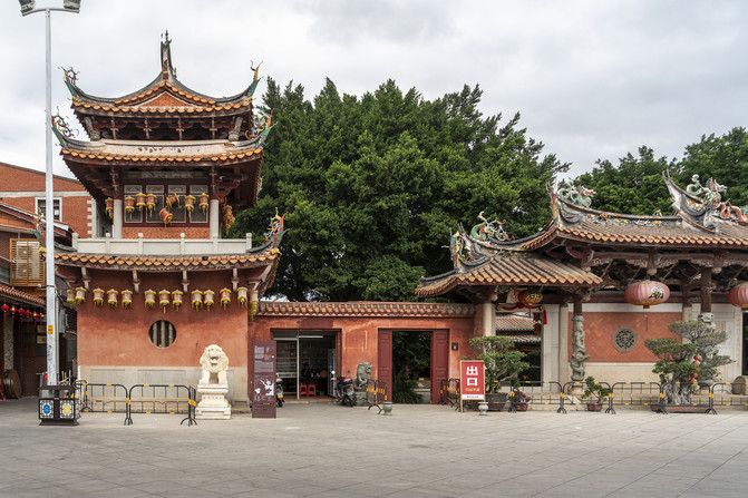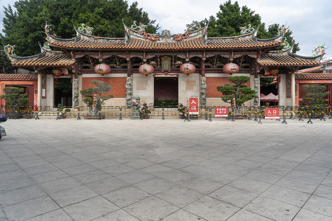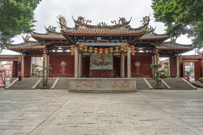 上面图里是泉州天后宫的山门,这座门不是原装,也不是重建,而是从别处盗来的。这是一座牌楼门,上面斗拱抬梁架起一座屋顶,前后加檐柱,前面四根是石刻浮雕蟠龙柱。门前一对青石狮子,南狮风格。上面是黄色琉璃瓦单檐歇山顶,正脊分成了三段。脊刹是龙门下的一座三层宝塔,两边还各有两条飞龙,满面喜庆笑哈哈。垂脊的脊端站着天后手下的女兵,专门捉拿海妖。没见过龙门的可以看看这个脊刹,龙门就是这样的。这些装饰都是贴瓷片装饰,女兵是砖雕。三间大门两边还各有一间侧门,一间外面写着“入口”,另一间里面写着“出口”。大门上的额匾是“泉郡天后宫”。中国自秦开始的郡县制早都没有了,清代改名“天后宫”的时候,泉州是府。虽然府在县之上,但也不应称作郡。莫不是林默娘羽化升天前这里叫泉郡?不对呀,那时叫平海军。这块匾来路可疑。