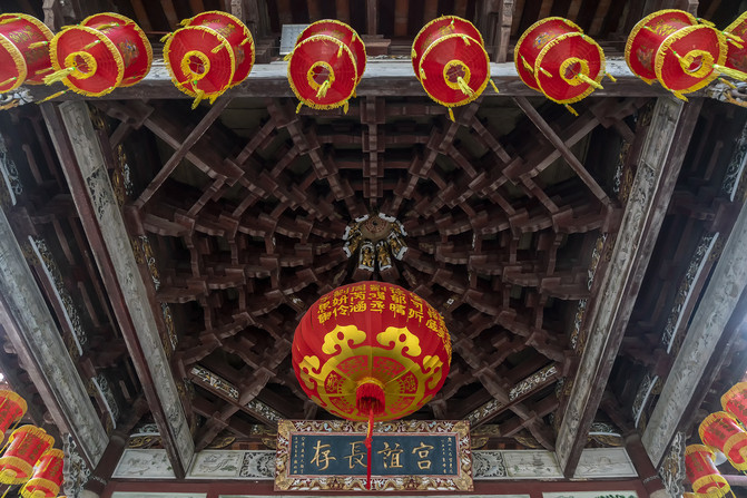 看看戏台的顶上,是有藻井的,这个是八角藻井。