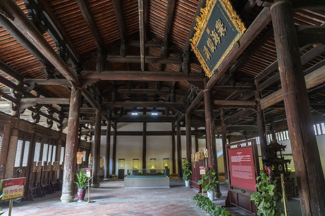 这是四间进深的抬梁结构,因为把后檐廊封闭,所以看上去好像是五间进深。殿内看似乎前坡短后坡长,从外面看的话,加上前檐廊,前后屋顶坡是一样长的。三面砌砖山墙,前面每间四扇隔扇门。上面的“寰海镜清”匾是祝贺本宫八百岁的贺匾。