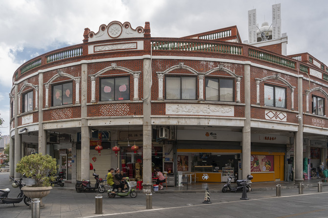 泉州既然是海上丝路起点,那肯定和西方交流颇多。古代丝路是东风西渐的通道,近代以来,海路成了西风东渐的管道,不仅是西方思想,西方的文化和艺术也随之而来。你看这街角骑街楼的装饰,就是西风东渐在泉州地方装饰风格上的渲染。骑街楼是华南建筑民居样式,石柱框架应该算是泉州常见,二楼石刻浮雕和贴砖拼图也是中国元素。泉州特色在哪儿?二层和顶层外墙上的红黑相间贴砖是泉州特色。除了这种贴砖,泉州建筑还有用窄条贴砖拼外墙缝的方式。那西风东渐的反映呢?你看二层窗外罗马柱顶着一个弧形山花,这是西式风格,方的罗马柱。你再看楼顶的山花造型,这也是西式风格,上面本来应该每侧都是涡卷接反向涡卷,但这里只有单向涡卷,叫新巴洛克。你再看楼顶栏杆柱,这也是西式风格,叫做Balustrade。这里的新巴洛克风格是欧洲十九世纪的复古艺术潮流,还有新古典、新哥特和新罗曼等等。所以,这座楼应该是清末民初所造。