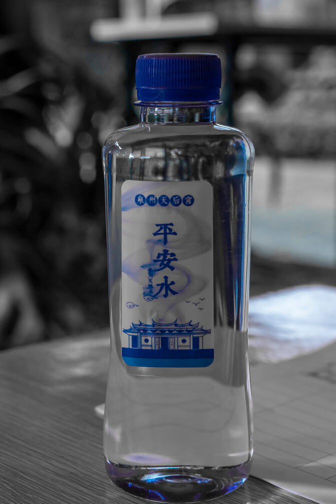参观完毕,和宫人一边聊着一边往外走。走到门口宫库,宫人取来一瓶平安水送给我。说这个水有妈祖之光,可以保平安。
