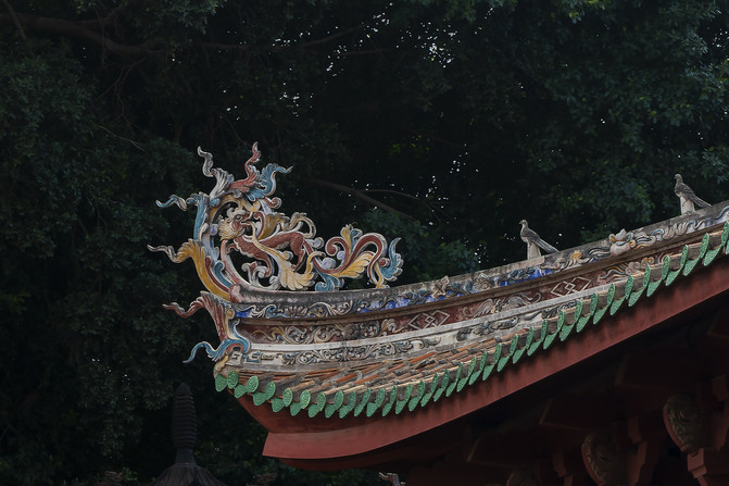 这座正殿坐在三尺高花岗岩台基上,面阔五间进深四间。我发现不对劲的地方是上面有三层屋顶,其实这上面是重檐歇山顶,下面那个是面阔五间敞厅的顶。正殿前面不设檐廊,而是一座敞厅,这样的建筑也不罕见。这座歇山顶的正脊比明清式样短了很多,而且山面是倾斜的,这是宋代风格,正定隆兴寺摩尼殿和毗卢殿都可以看到。明清歇山顶的山面是竖直的,所以明清的歇山顶是站在那里,宋代则是趴在那里。屋顶上虽然是黄色琉璃瓦,但滴水和瓦当是绿色的,这不能算是剪边。闽南风格曲面坡弯脊燕尾杀,这条正脊和开元寺文庙都不一样,它是镂空砖雕的脊背,然后再贴瓷装饰。这里有脊刹,妈祖庙用什么做脊刹呢?仔细一看,是观音菩萨的净水瓶,里面插的不是杨柳枝,而是一朵含苞待放的红玫瑰。这个配合年轻的妈祖林默娘真是太贴切了!垂脊端坐着的是女将军,戗脊上站着的还是白鸽。泉州的白鸽有点信仰不专一呀,这是儒释道全修的意思吧?敞厅中间是两根石刻浮雕蟠龙柱,高浮雕。看看新绘的脊端装饰。