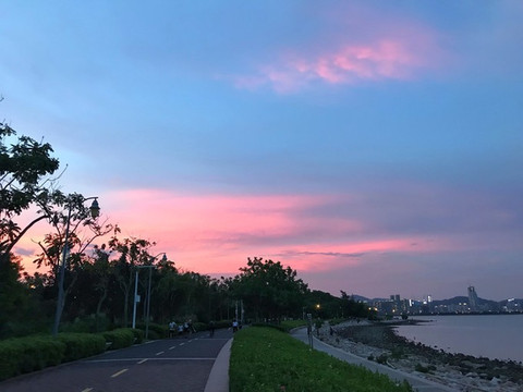 从美术馆出来已经接近傍晚,一路开车来到深圳湾,深圳湾对面就是香港,看起来很近,今天的晚霞是彩色的,很多本地市民也会带着孩子来公园里玩,放眼望去,远处是数不清的高楼大厦,不知承载着多少人的梦想