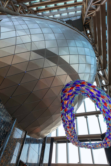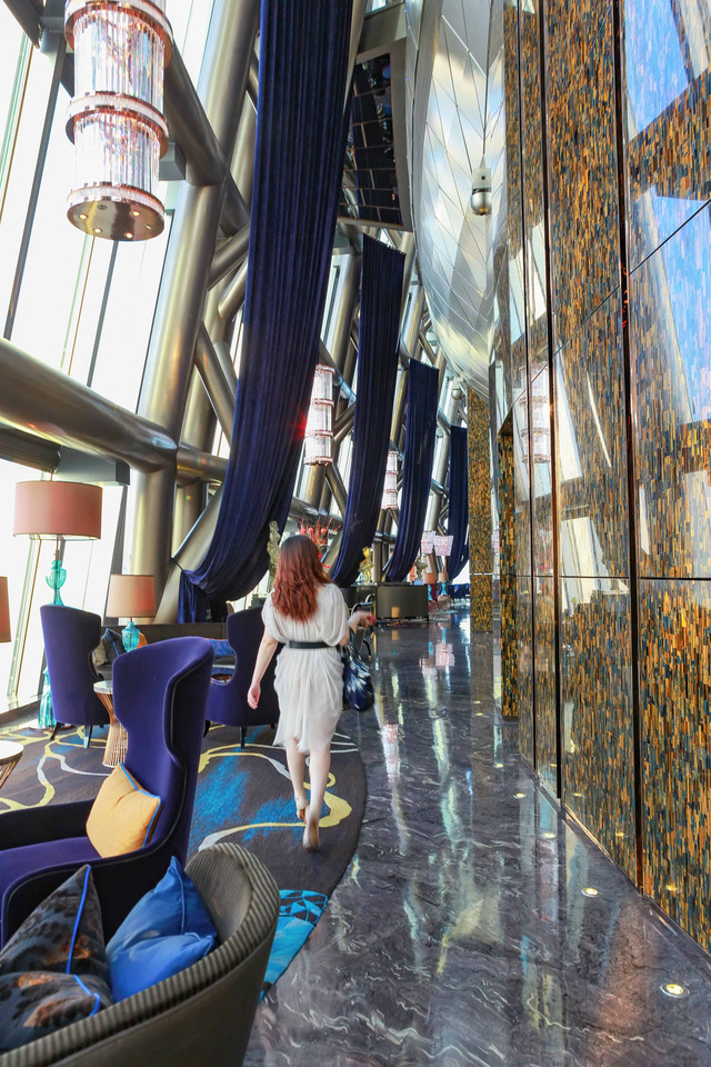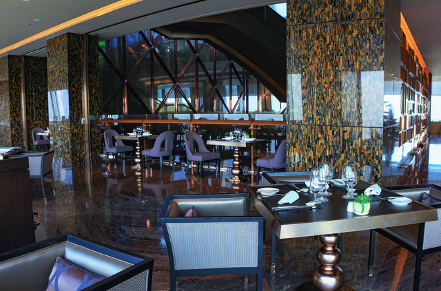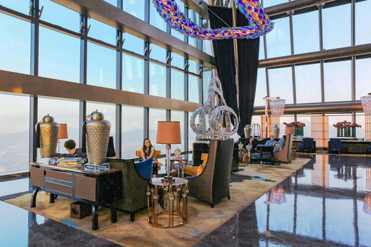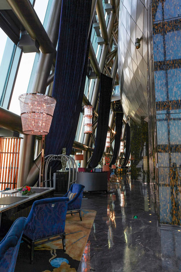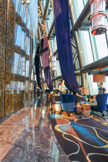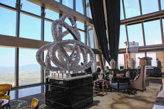 在瑞吉酒店96层的闲逸廊,一个喝下午茶的地方,尤其520这天,体验这家典雅高贵的环境,欣赏这里经典传统氛围中完美彰显的现代风格颇具情趣——富丽的宝蓝色窗帘悬挂于走廊,零星点缀着酒店的钢制构架和可包揽深圳罗湖区全景的高大玻璃窗,轻轻飞舞间为您揭开酒店的总体色调面纱——宝蓝色、紫色和青铜色完美搭配。