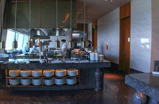 京基100的第96层,光这个高度和视野就让国内其它酒店黯然失色——在整个空间内,金色的抽象艺术作品与意大利青铜色镶嵌图案的玻璃瓷砖的那种西式绅士风,收敛了很多国人行为习惯的随心所欲和自由散漫。360度的落地观光窗,成为眺望深圳城市风光和香港农村的绝佳平台。看来,老婆“石头剪刀布”赢的非常伟光正!