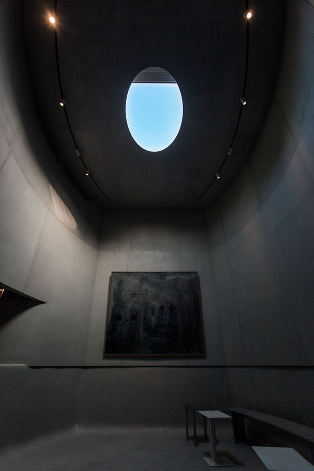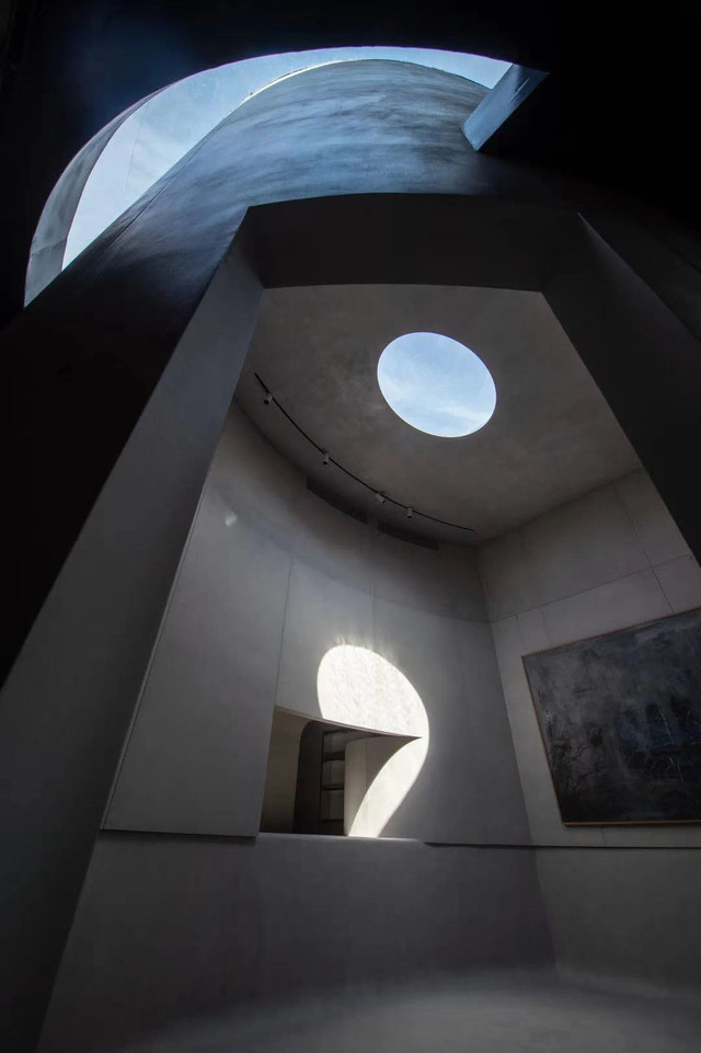 你能看到一座矗立的水泥圆柱体,钢板为柱,水泥糊墙,顶部有一天窗。阳光在一天里换着模样倾泻下来,与笔直的混泥土空间相映成趣,上演一出光影大戏。