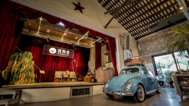 占地面积最广的开放式中庭,是旧物展示区,还原过去人们生活的模样和场景。旧物仓正中间,是过去精彩纷呈的戏台,在改造中成了生活场景的呈现,像一个布置妥当的家,戏台旁还特意安上了一个供小朋友玩耍的滑梯。