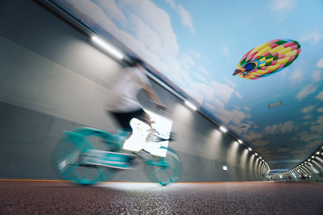 下山的出口也不止一个,若是走常规山道下山的话将会到达板樟慢行隧道,这是现今国内最长的慢行景观隧道,隧道长达1235米。漫步其中,最亮眼的应属顶部的3D手绘,仿佛隧道外的蓝天白云、飞鸟、热气球、航天器都延伸进了隧道内,完全没有传统隧道的逼仄之感。伴随着音乐声,40个投影灯所投射出的海洋景象和珠海城市风光一一在眼前掠过,好不壮观。随处可见骑行的人们,携手漫步的老人,打闹的孩童,形色各异的人们在这个长长的通道里刻画着属于珠海人的生活手绘。