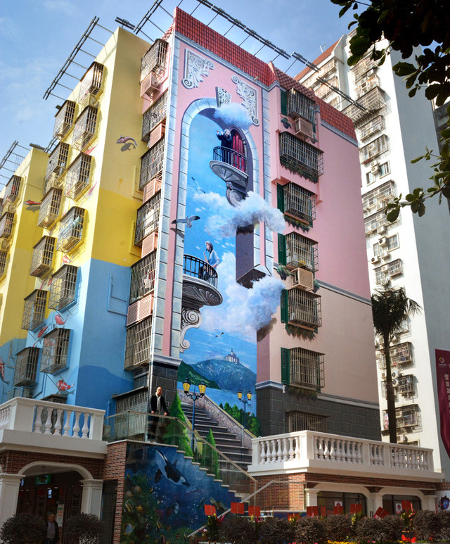 穿过广场,从地下通道上来后就是来魅力壁画村。老早就听说拱北有座僻静而充满艺术特色的异域小镇,四周墙壁全被3D壁画覆盖,是拱北的标志性建筑之一。来魅力壁画村是目前国内最大的室外墙绘艺术品,由错觉艺术家万氏兄弟耗时半年,消耗一吨颜料,打造而成的6000㎡巨幅壁画。