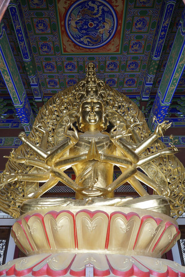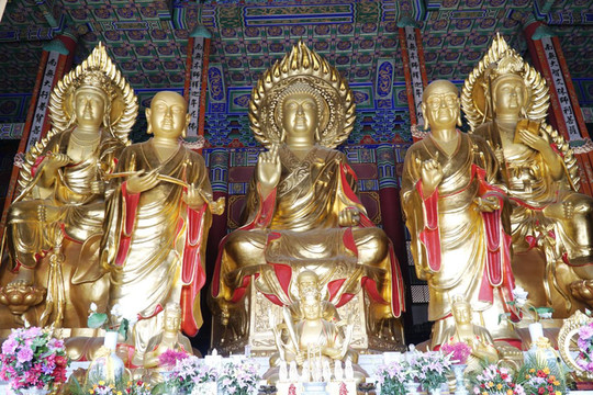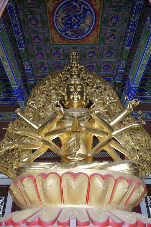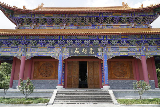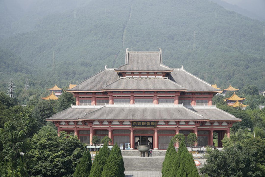 仿北京故宫太和殿,重檐九开间。高大敞亮,金碧辉煌,为全国佛教寺院中体量最大的殿。