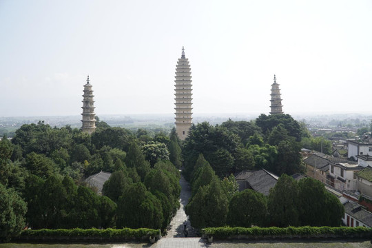 苍山应乐峰下,大理古城西北,在南诏丰祐年间(823~859年)建有模宏大的皇家寺院崇圣寺,三塔立寺门前。后寺毁,三塔依然巍立。
