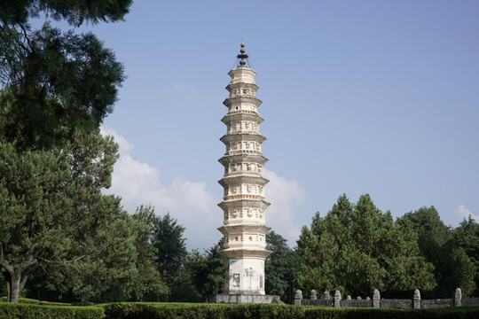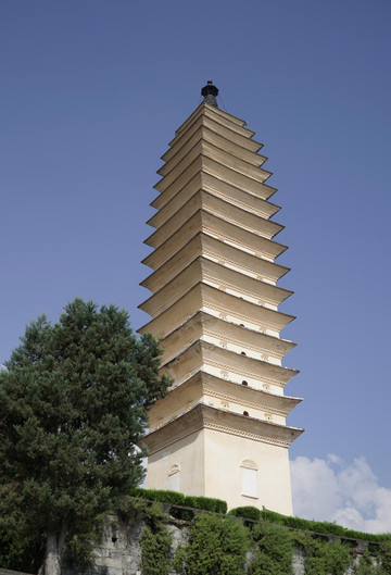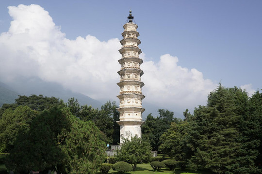 主塔千寻塔,“寻”是古代长度单位,意指塔高。塔高69米,16级密檐式方形空心砖塔。塔心内有木梯盘旋而上,与西安唐时期的小雁塔相似,为典型的唐塔建筑风格。塔顶有塔刹,藏有大鹏金翅鸟。据说大理地区多水患,治水必先治龙,龙畏大鹏,大鹏起镇水的作用。