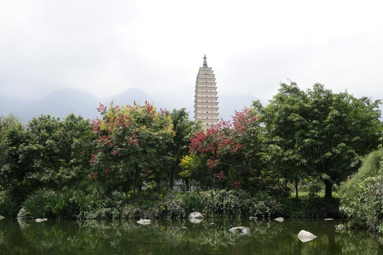 聚影池形如洱海,聚三塔钟楼倒影于一池之内,是摄影留念的理想景点。