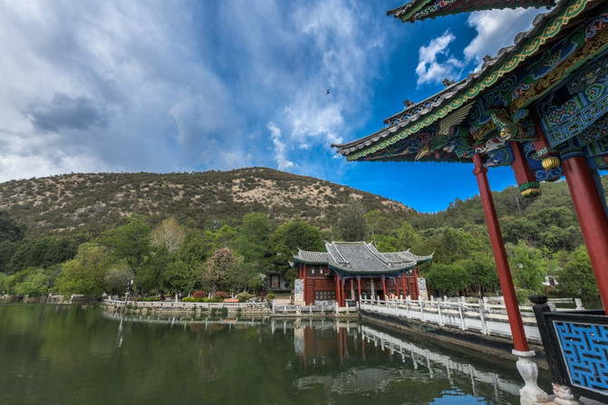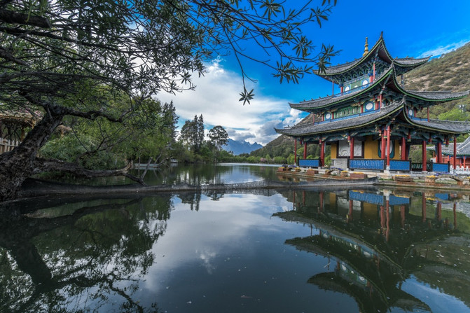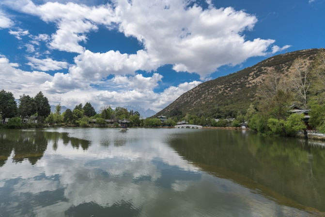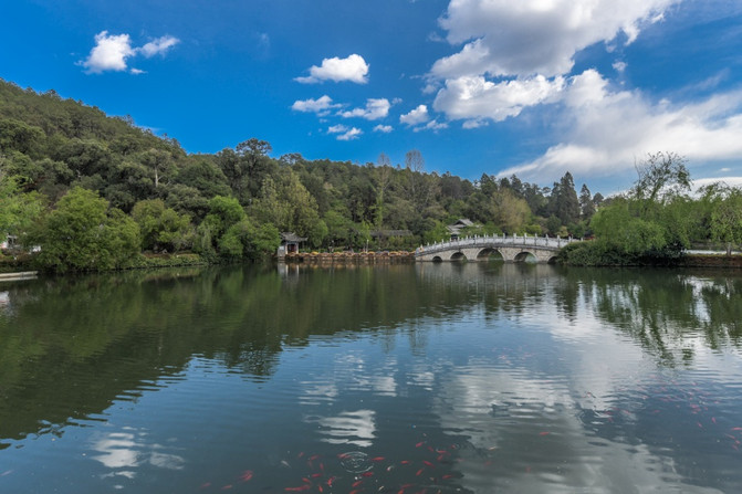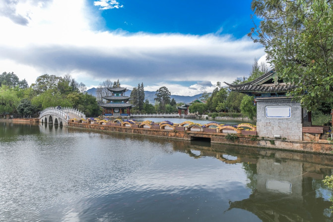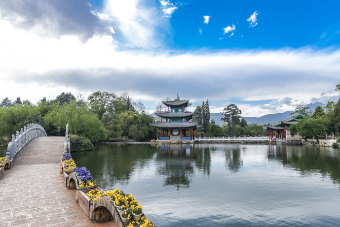 丽江黑龙潭听起来是多么普通的地方啊,更何况还是一处收费的景点,而且是一处紧紧的咬住门票不放的景点,故而很多人来丽江的人都对此景点放弃了。然而,从本月开始终于打破了免费开放的先河。刚好在丽江出差的我,有幸成为首批免费游览丽江黑龙潭的游客,是不是很幸福?黑龙潭景区是丽江古城唯一的水源地,这里的源头来自玉龙雪山一带,生态环境极佳,加上雪山的衬托,让黑龙潭这样听起来很普通的景点变成了人间仙境。丽江因澜沧江 、金沙江、怒江在此处并流形成秀丽无比的城市而得名,在丽江除了看不到茫茫无边的大海之外,几乎可以看到绝大部分的生态景观。当你进入丽江黑龙潭后,会被宛如仙境的风光所惊艳到,也会被张张都可以做桌面的照片而震撼到!这就是丽江黑龙潭美丽之处。楼亭、桥梁、湖泊、雪山、绿树、鲜花成为黑龙潭最吸引眼球的亮点,走上五孔桥上能够欣赏到不一样的风光,在这里换个角度就见到了不同的美景,这就是黑龙潭的特有魅力!如果说之前听名字很普通或者门票不菲而放弃了黑龙潭,不要紧!现在撑着丽江古城管委会免费对外开发的惠民政策,如果方便的话可以到此游玩一番。在这里,几乎每座桥梁都是有故事的,本应该只有自然风光的黑龙潭却不经意间沾染了与历史人文的元素。这样的黑龙潭还是很值得来欣赏一番的了。眼前所看到的这座楼亭是不是很像唐宋时期的建筑物?此物名曰得月楼。得月楼以唐末宋初时期建筑为框架建设而来,看起来是不是很有日式特色?如果有这种感觉那就对了。丽江本来就是一座四季如春的美丽城市,到了春末更是美的不可言喻。黑龙潭到4月底前都能欣赏到晚樱以及其它各种各样的花。游走其间,快要把自己写入了画卷一样。看到黑龙潭处处都是美景,估计很多人都心动了吧?还有很多人急着疑问目前黑龙潭的防疫和人流量情况。现在的丽江客流比同期减少至少来80%以上,还有全国持绿色健康码的游客可以自由出入黑龙潭景区。