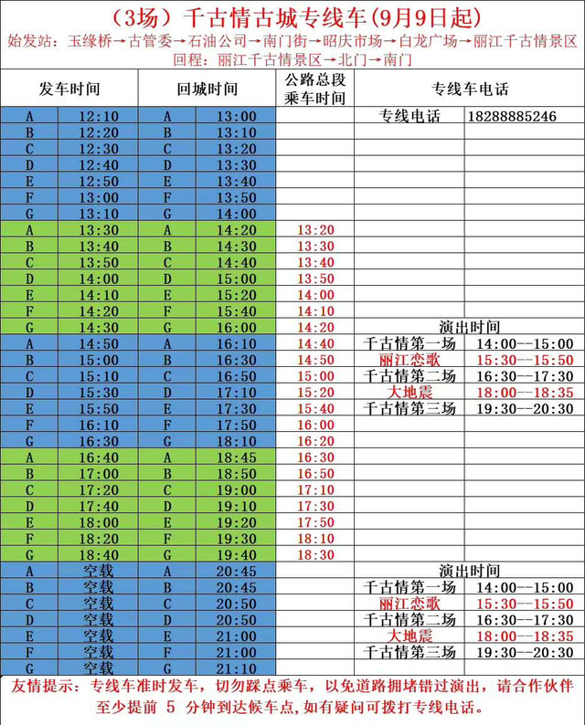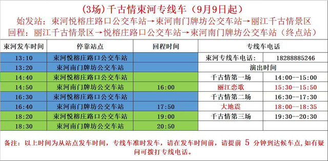 订票之后,可以在古城周边或者束河古镇周边凭订票短信搭乘千古情专线车前往景区,也可以自行打车前往观看演出(注意:千古情专线车会根据演出的场次做出相应的调整哦)