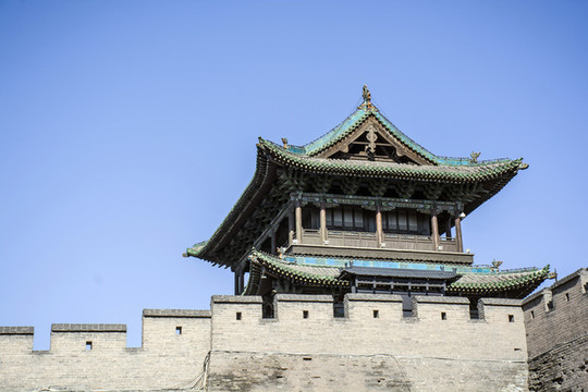 平遥城墙平面呈方形,周长6162.7米,墙高10米,顶宽3—5米,墙顶外筑2米高的垛口墙(又称挡马墙),内砌女儿墙,墙身素土夯实,外包青砖。环城每隔50 —100米有一个突出的敌台(也称马面),台上筑有敌楼一座,共有72座,垛口3000个,重门瓮城六座,南北各一、东西各二,每座城都建有重檐歇山顶城楼,城墙四隅角楼四座,城墙外四周有深宽各3米的护城壕,六门外原设有吊桥,沿河植槐柳。