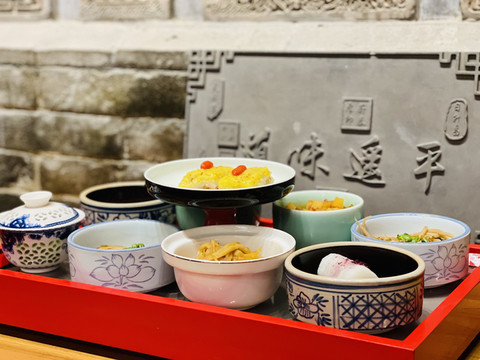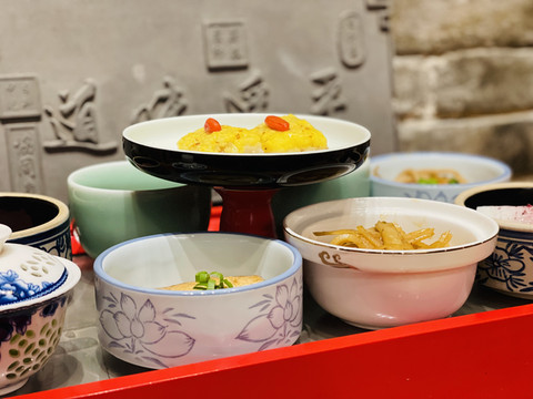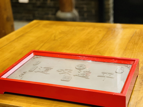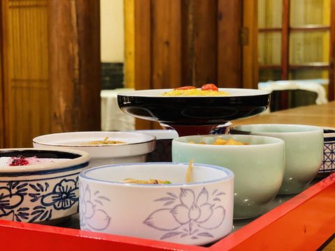 【平遥九品】选用的餐具也很有特色,很适合拍照打卡。红色的推光漆器制作,底部是印制的古砖。九品中每个品种都有对应着的一个不同的故事。