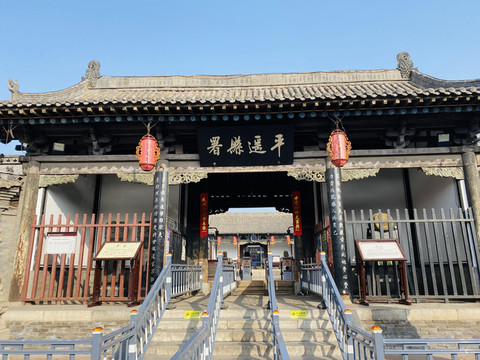 走到【听雨楼】就到古县衙了,这是当年 平遥七品县令办公审案的官署,【县衙】初建于元至正六年(1346年),至今已经有六百多年的历史。