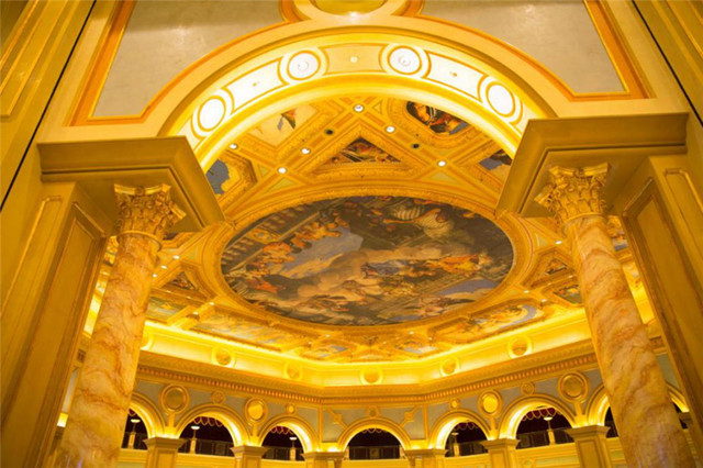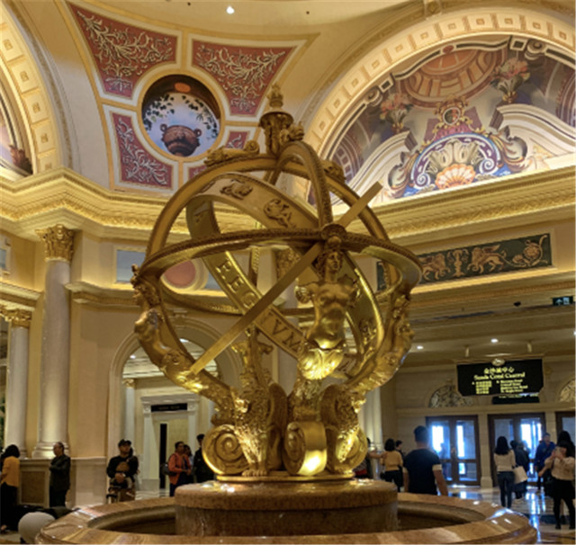 澳门威尼斯人酒店的大堂是我住过的酒店中最豪华的,两人高的金球赫然伫立在大堂正中间,不注意都不行。第一次看到如此精美的欧洲雕刻艺术品,感觉自己就像是进入了艺术博物馆。大堂一片金色,让人由衷地感叹,这家酒店的确有一股由内而外散发的高贵气息,就像是中世纪的欧洲宫殿。