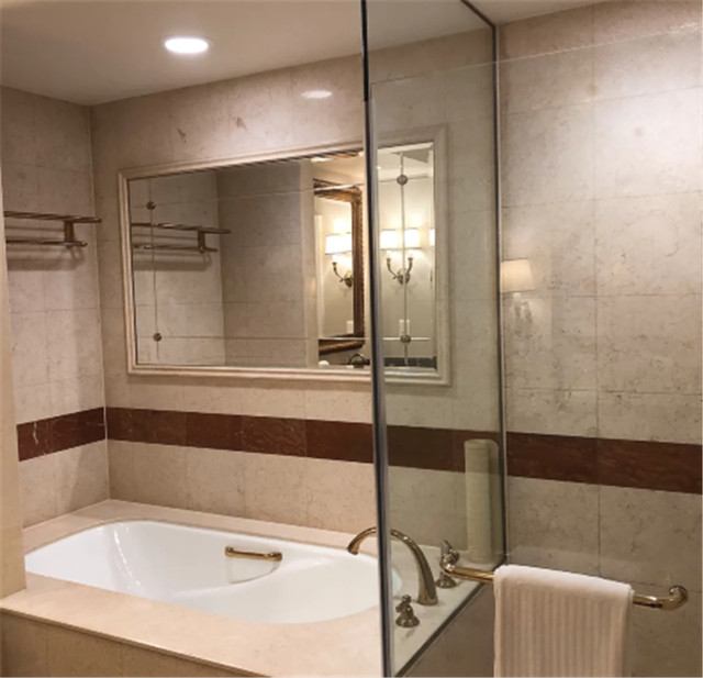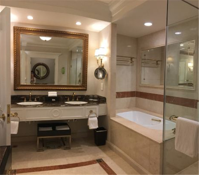 进入浴室,就可以看到门口是一个梳妆台,里面的洗漱台也超级宽敞。喜欢泡澡的朋友可有福了哦,大理石打造的浴缸等你来体验!