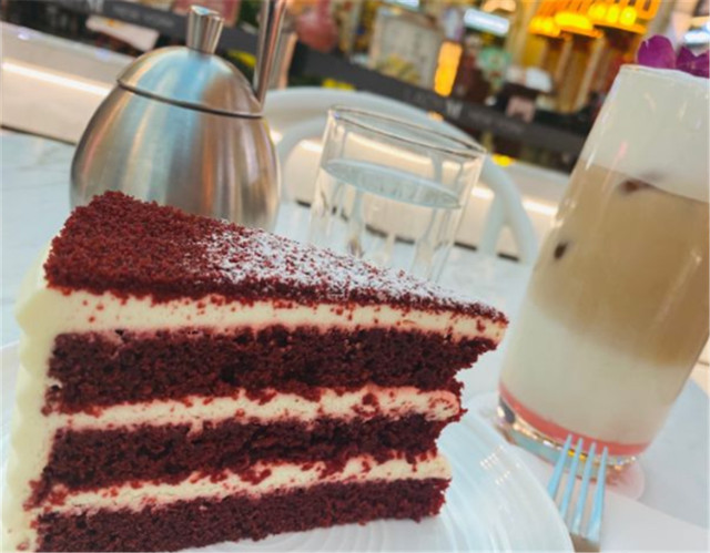 我点了红丝绒蛋糕,口感非常细腻,味道不是很甜腻。同事点的是玫瑰千层,也很Nice!它家的蛋糕真的是颜值与美味并存,难怪这么受欢迎。