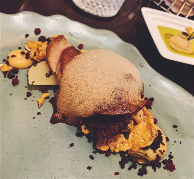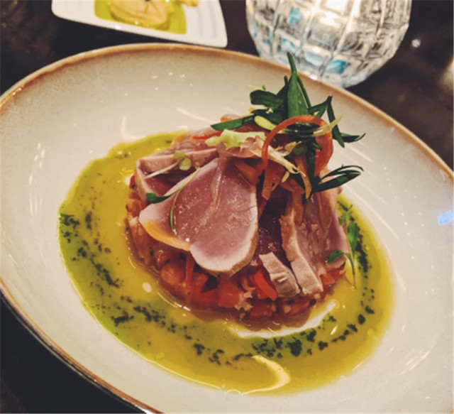 最后两道菜是炙烧吞拿鱼和香煎鹅肝,我比较喜欢鹅肝,里面有苹果,还有巧克力面包屑,吃起来很香。