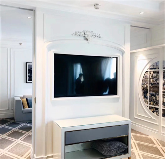 套房整体色调偏淡色系,我个人非常喜欢~客厅和卧室是打通的,有半堵墙,墙壁上安了电视,很有设计感。