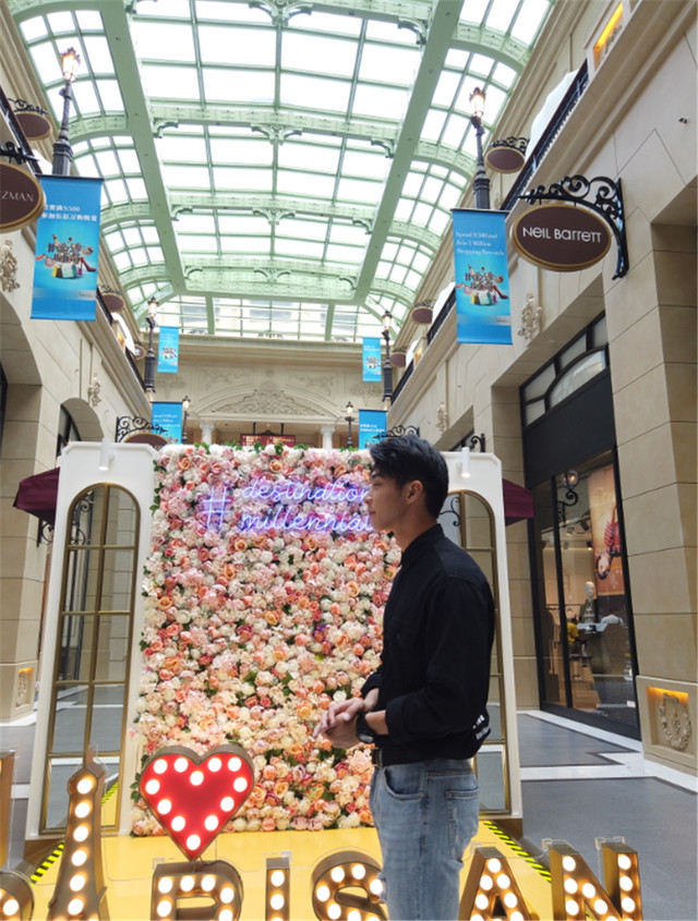 和粉嫩的花墙合个影,手都不知道往哪放。游客照认证!
