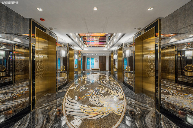 酒店设计现代与古典巧妙融合,不同楼层的电梯走廊,地面和天花装饰是充满贵气的龙凤图案,展现了浓浓的中国传统文化氛围,金色的电梯门更增添了新葡京酒店的富丽堂皇,满眼尽是黄金甲。