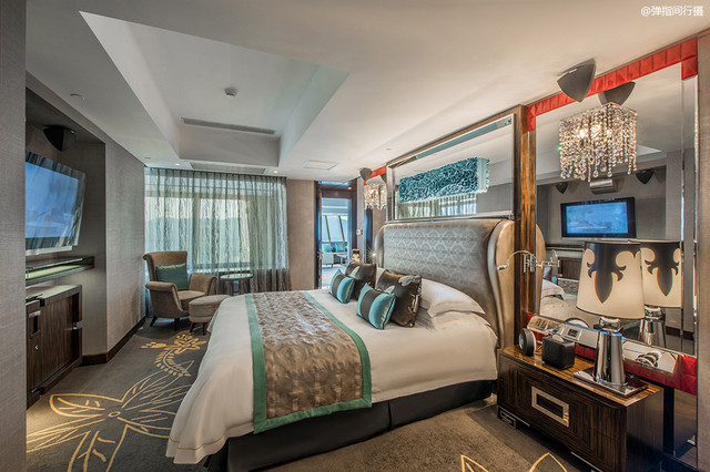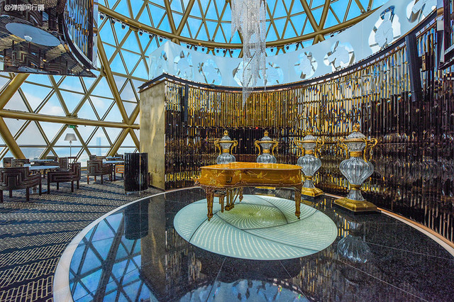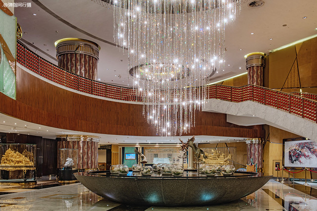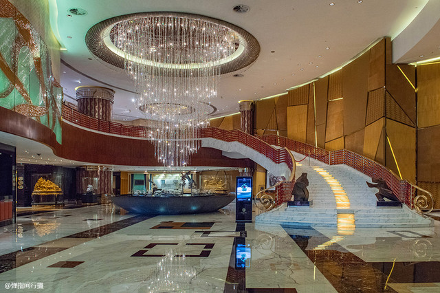 建筑外观金碧辉煌、美轮美奂,酒店大堂富丽堂皇、奢华无度,宽敞明快的空间饰以各种水晶灯和镜面墙,贴满渐变马赛克和高档软包的立柱和各种典雅纹样的地砖交相辉映,呈现出高贵气派的格调。大堂是一个极具看点的地方,让人仿佛步入了一个气宇轩昂、珠光宝气的瑰丽殿堂。