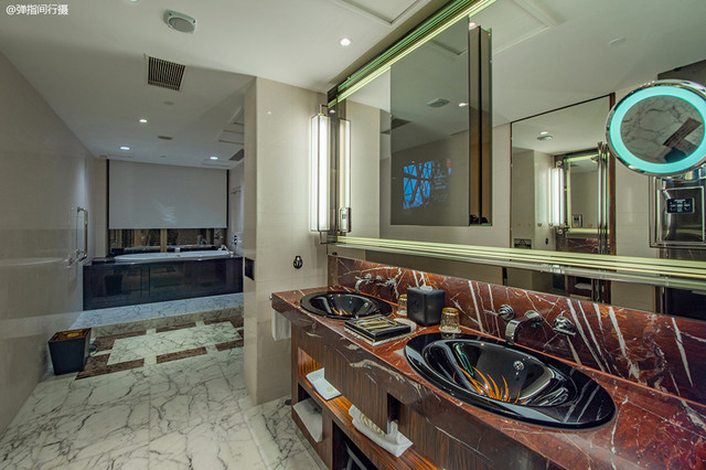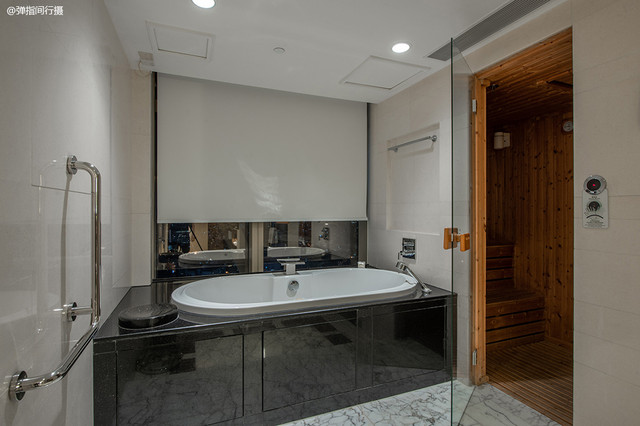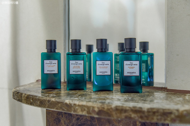 客房的卫浴空间空间独立,宽敞明亮,地板、洗漱台全部采用天然大理石,光是建材用料方面就已经让人感到贵气十足。卫浴空间除了配置有城景浴缸之外,更有私家干蒸桑拿房,洗浴用品也采用了爱马仕“橘绿之泉”洗护套装,以柑橘精油及柠檬香气为主成分,前味融入了佛手柑、柠檬及鲜橙的爽朗清新,带出无以言表的奢华感。