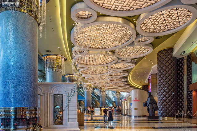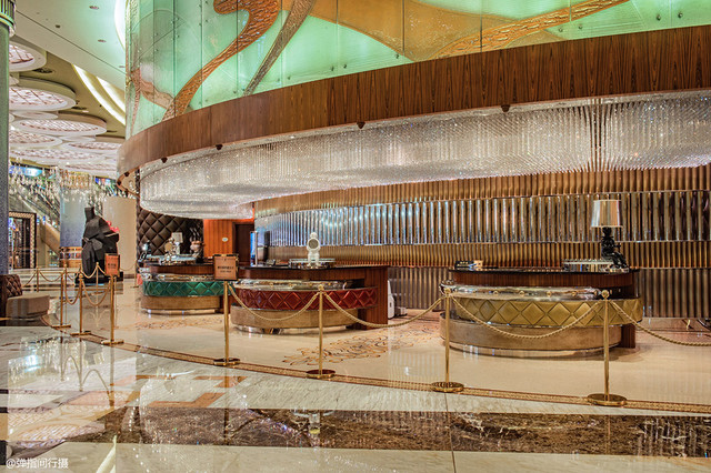 其中,位于大堂旋转楼梯中央的莲花池,既巧妙地融入了澳门的象征莲花,还体现了“聚水为财”的风水玄学,水晶吊灯的运用非常吸人眼球,光彩夺目,晶莹剔透,由天顶直泻而下,仿佛一幕洁白无瑕的瀑布,源源不断地水注入莲花池中,寓意财运滚滚来。