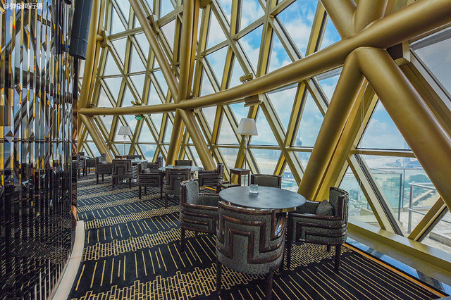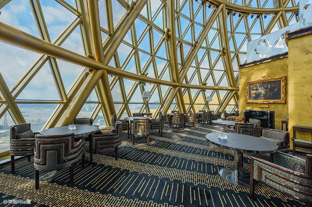 餐厅设于新葡京酒店顶层238米高的圆顶内,玻璃与钢铁结构营造出强烈的未来感,设计宛如一个环形艺术馆,可从270度的超广视角将澳门繁华城景尽收眼底,光看餐厅设计和环境就足以让人赏心悦目。