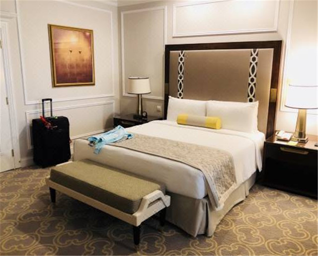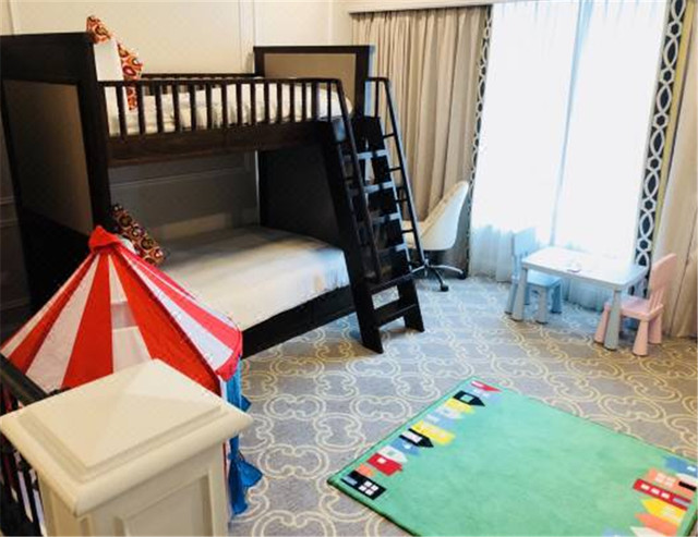 天伦乐套房是澳门威尼斯人酒店推出的亲子套房,里面有一张大床和双层的儿童床。房间面积有70平方米呢,非常宽敞,卧室和儿童区域都铺了地毯,我家那小子脱了鞋,穿着袜子就在上面跑来跑去,特别闹腾。