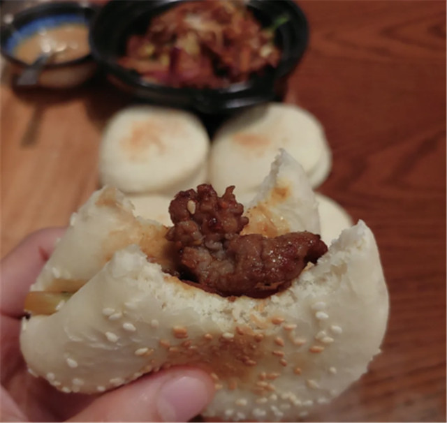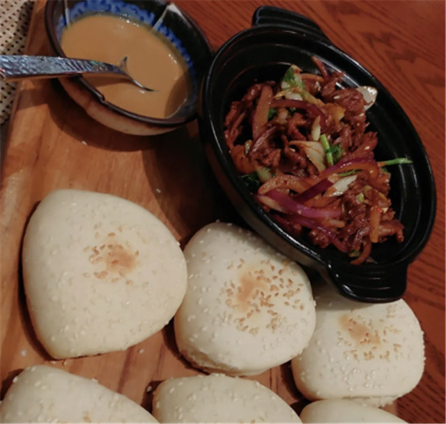 炒烤羊肉夹馍,一道硬菜,几乎每一桌客人都必点的招牌菜!份量足,馍软软的,旁边还有花生酱,味道不赖哦!
