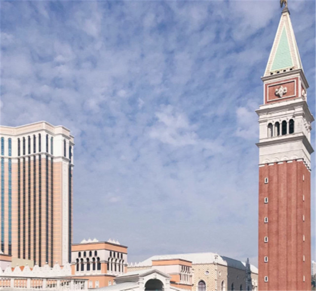 酒店周围就是一个超大的人工湖,真的有种水城威尼斯的感觉。欧式建筑跟周边的高楼大厦形成鲜明对比,更有异国风情了。澳门的天气很好哦,大太阳还有点晒呢。