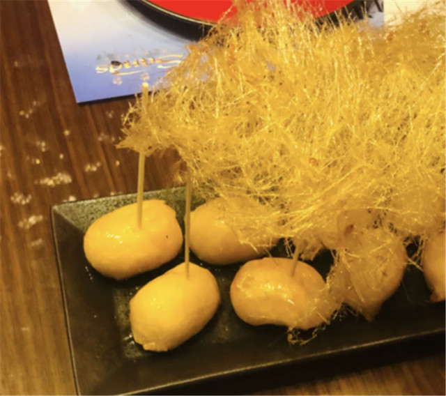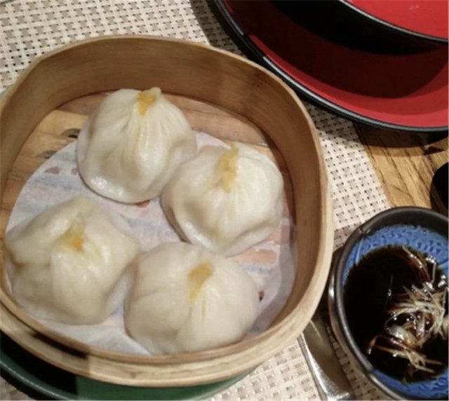 孩子不能吃辣,给他点了粉蟹小笼包和拔丝香蕉。小笼包皮薄馅多,里面的汤水很鲜。上桌的时候,服务员还贴心地提醒有点烫。
