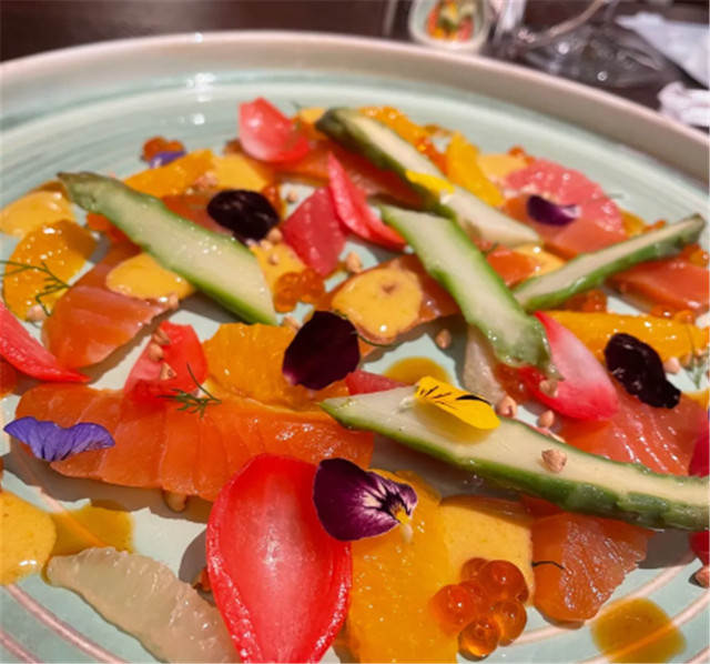 烟熏苏格兰三文鱼,这道菜一上桌,感觉昏暗的餐厅都变的明亮起来了,色彩太鲜艳了。除了新鲜的三文鱼以外,里面还有芦笋和柚子肉作为搭配,口感清爽。