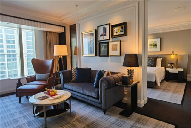 我们入住的是路易套房,面积有75平方米,一进门就感觉很宽敞。房间设施完备,卧室和客厅分别有一个液晶大电视,看起剧来特别爽。