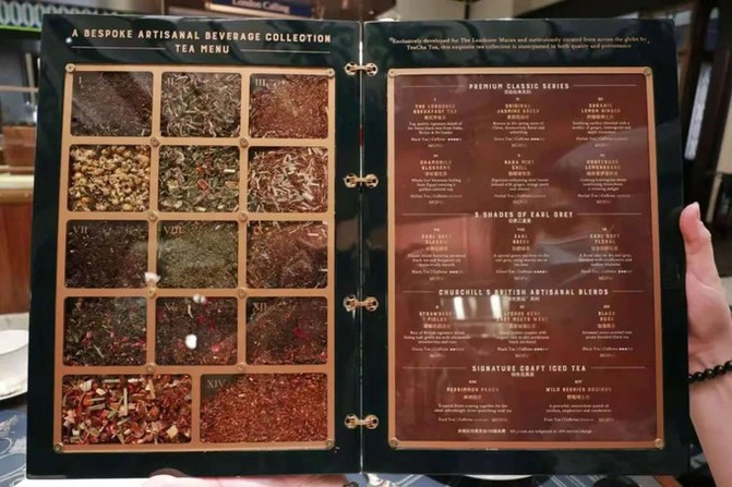 首先是一本可以看到茶叶种类的菜牌,有实物展示也有详细的介绍,这样可以让顾客看着来选自己喜欢的茶叶,而用来泡茶的银制茶壶,和精致骨瓷茶杯,一切看起来非常高贵。