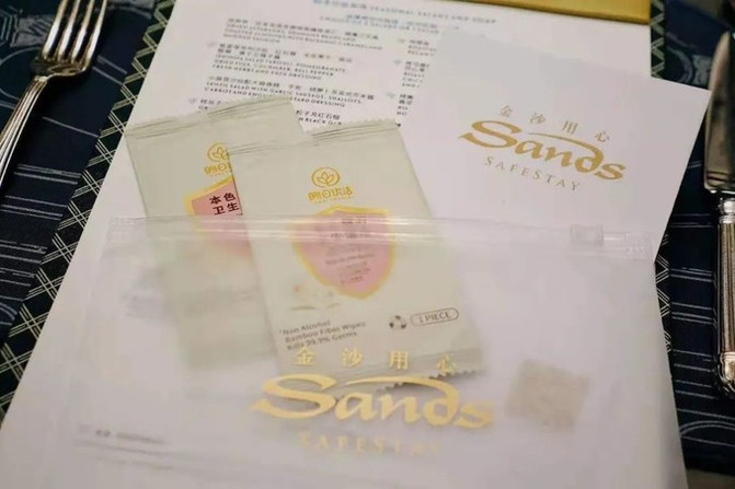 在餐厅坐下来都能获得一套“金沙用心”的防疫包哦,可反复使用的口罩袋+酒精湿纸巾齐全 ▼