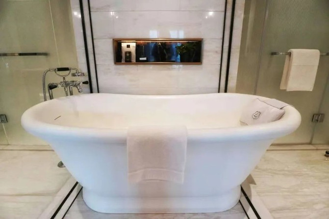沐浴控表示几乎和厅房等大的浴室真是完美,维多利亚浴缸+三套式强力淋浴设备,室内也是我的水世界 ▼