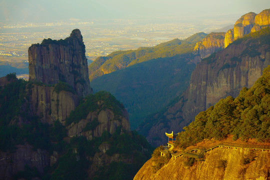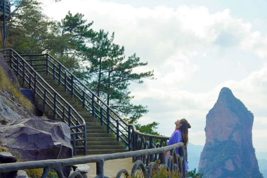 神仙居的莲花台是这山中最有意境的一个景点,莲花造型的平台似一朵莲花盛放于山林之间,圣洁美丽,走上莲花台,便可眺望远处的观音峰,是一处绝佳的观景位。