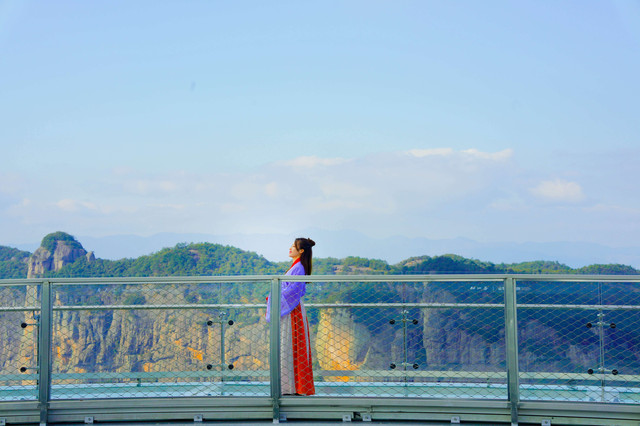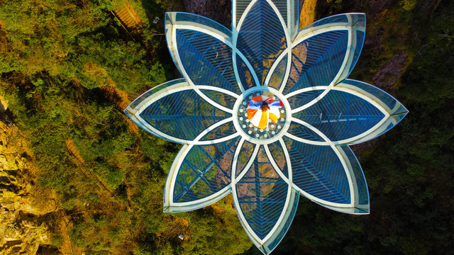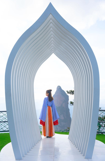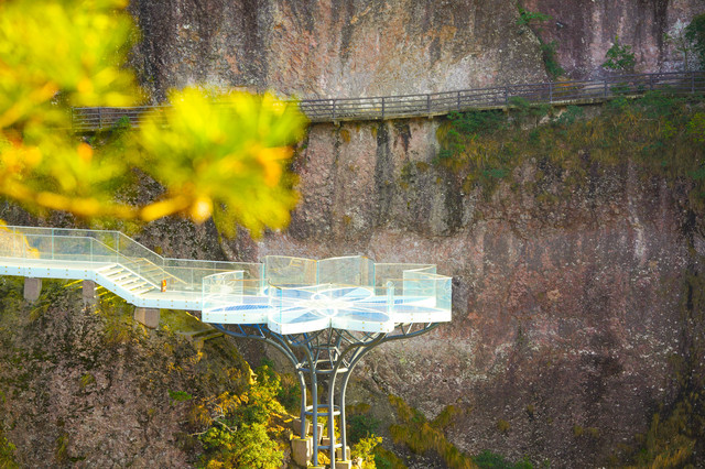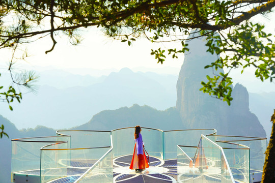 观音峰是一个天然形成的观音石像,南天顶上建造了一个很有科技感的玻璃平台,凌空而架,置于陡峭的悬崖之上,与观音峰遥相呼应,可以近距离观赏观音峰。走上玻璃平台,是一次非常考验胆量的体验,低头看脚底下便是万丈深渊,极目远眺可饱览仙境盛景,祈福新年和顺圆满。