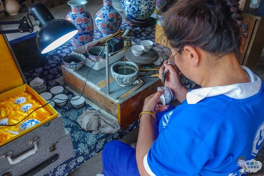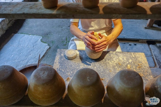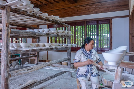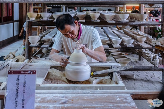 如今,我们来到绕南村其境内绕南古瓷窑址,这里不仅保存了多处宋、元、明时期的古窑遗址,而且还有大量水碓、古陶瓷作坊等瓷业遗迹,并且 成功 入选我国自然与文化双遗产。进入景区之后,沿着清澈的 东河 走,在很远的地方就能够听见“砰、砰、砰……”的声响,越靠近声音越响亮,走近后发现原来是水碓敲打油果的声音。这也是古代匠人们制瓷过程中最为原始的一道工序,便是利用自然的力量进行生产,用水碓加工釉果,采用这样方式高岭土的质量会更高,也会制瓷提供了丰富且优质的原材料。