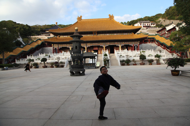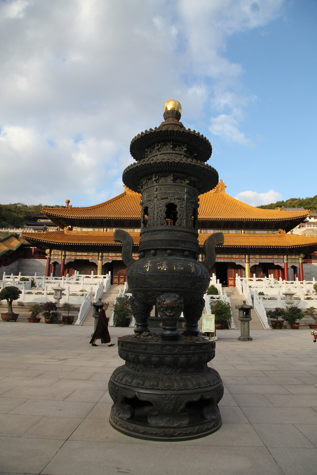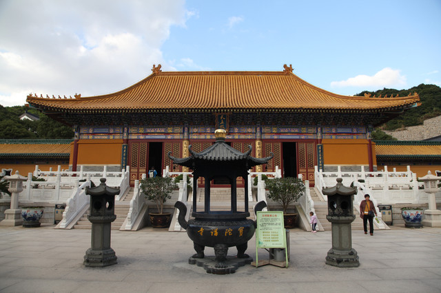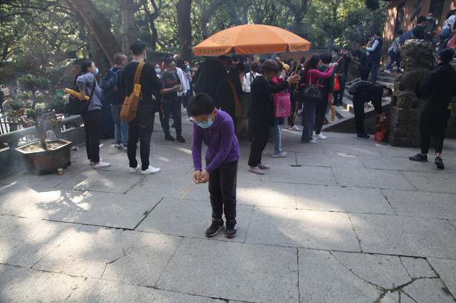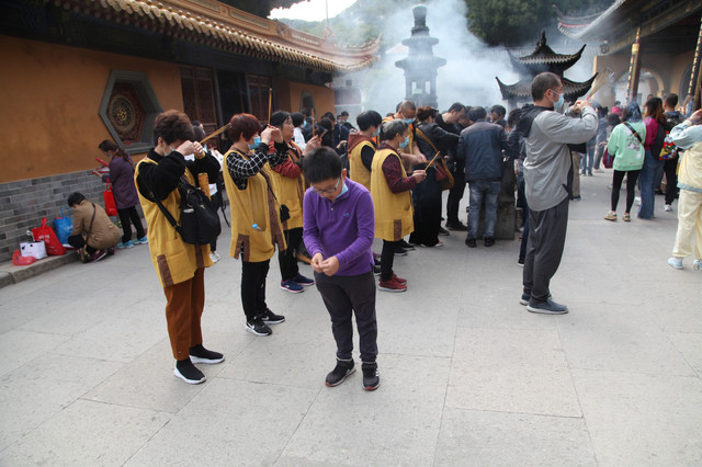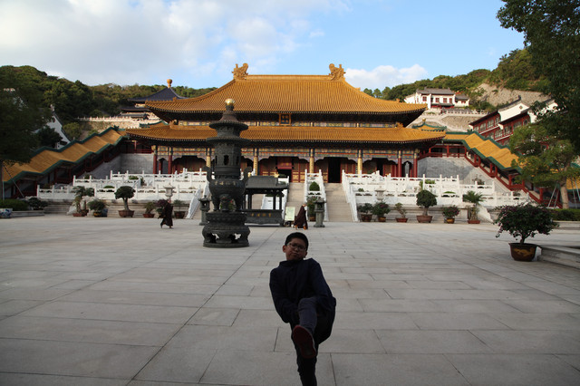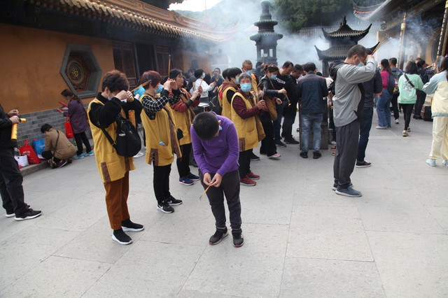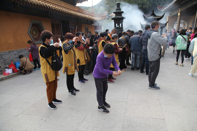 圆通宝殿是霞屿禅寺的主殿,我们在殿前广场上,每个人燃起三柱香,面对圆通宝殿,祈福纳祥,默默吟诵。祈祷完毕,龙太子把然着的香交给我投进香炉中。