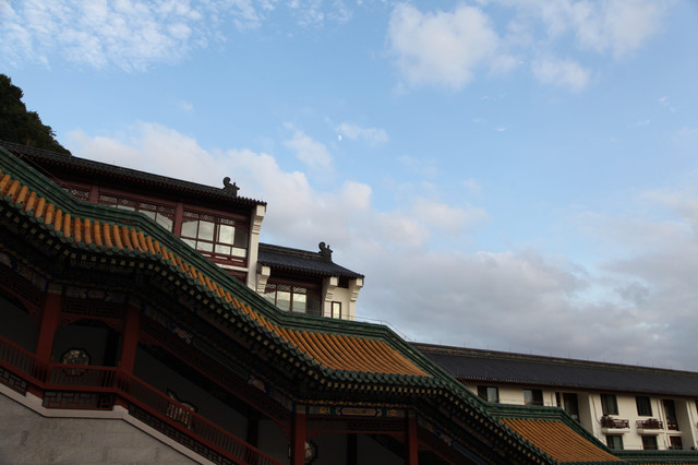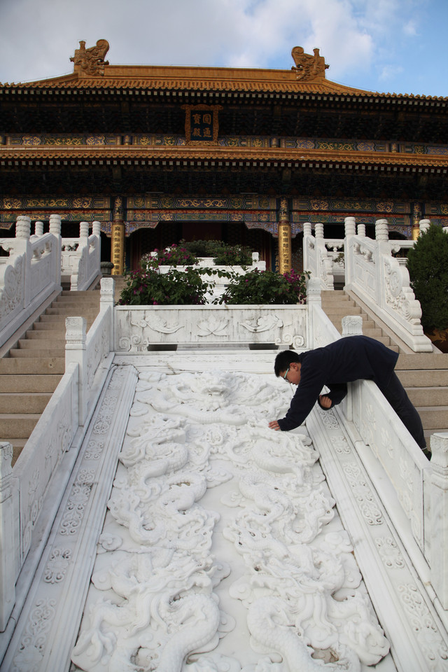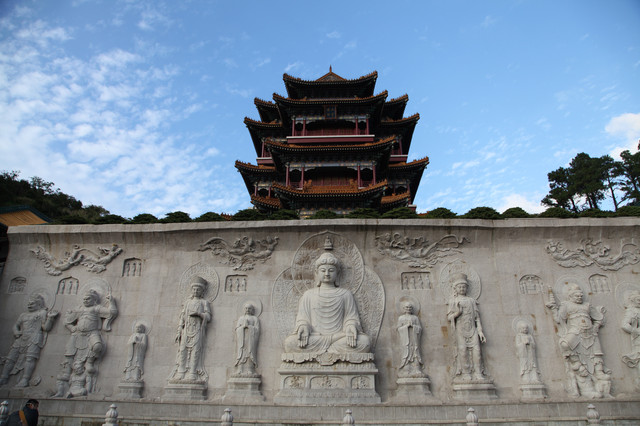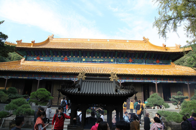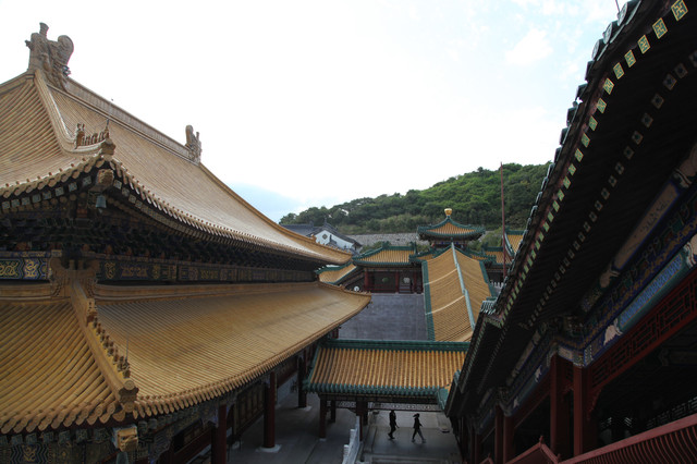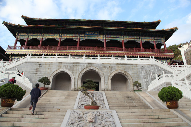 分层递进,磊起六层台基,逐层分别建起天王殿、玉佛殿、九龙殿、御碑殿、大雄宝殿、藏经楼,一进一层,层层迭迭,将整座寺院烘托得巍峨雄伟,颇具皇家寺院的雄伟壮阔,既有山行地势之托,兼具华彩内容之圣。