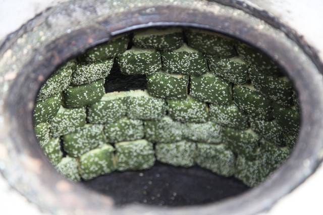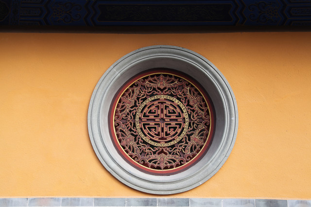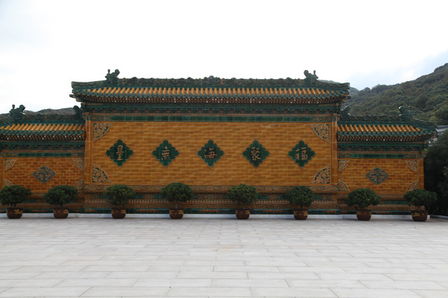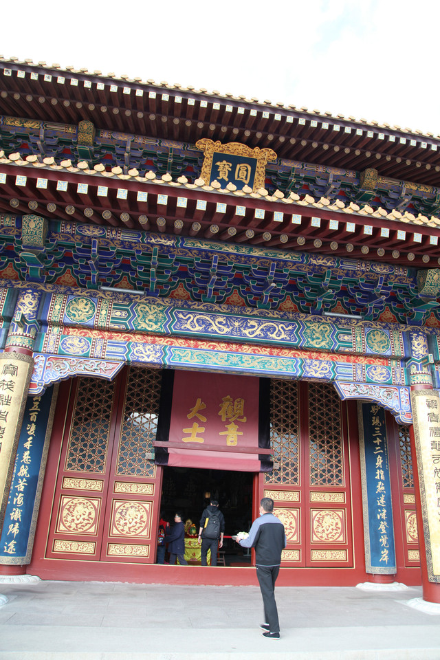 我们走进寺院最南端,那儿立有一扇抒有“福聚海无量”的金色的琉璃瓦照壁,衬以绿色的琉璃瓦装饰,显得庄重而内敛。